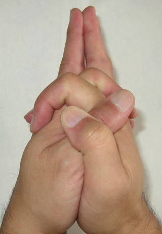 内縛して中指は立てて合わせる。人差し指は